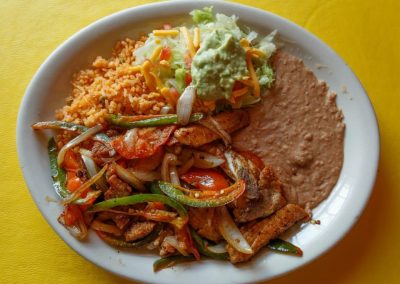 With two cheese enchiladas. Specify chicken fajitas or beef fajitas.
